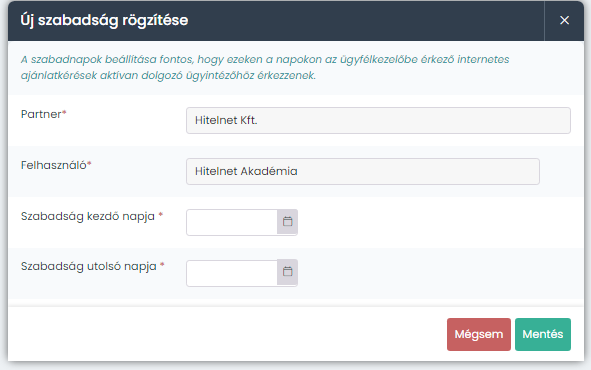 Kérjük, hogy figyelj arra, hogy ha hétfőtől vagy szabadságon és már hétfőn nem tudsz a leadekkel foglalkozni, akkor a rendszerben a szabadságodat péntektől állítsd be, mert ha azt csak hétfői nappal indítod, akkor a rendszerünk még a péntek-szombat és vasárnap beérkező leadeket keddi határidővel le fogja osztani, és ha nem kezeled őket, akkor elveszett leadnek fognak számítani.