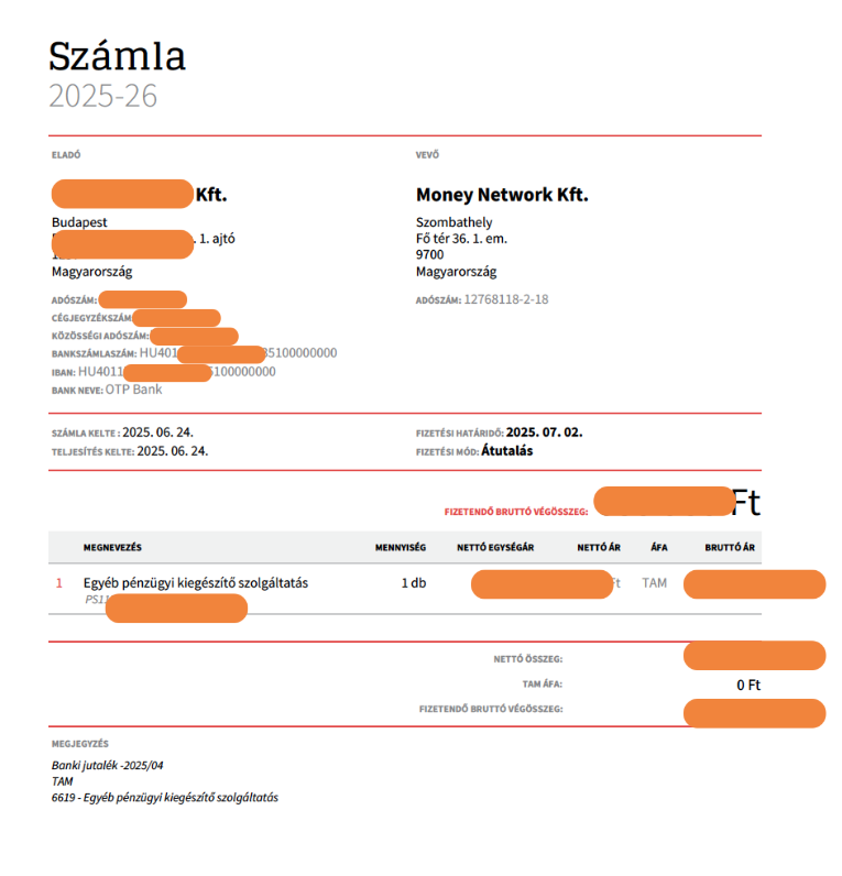 Vevő: MONEY NETWORK PÉNZÜGYI KÖZVETÍTŐ KFT.Cím: 9700 Szombathely, Fő tér 36. (1. emelet)Adószám: 12768118-2-18Postacím: 9701 Szombathely, Pf. 90E-mail: [email protected]